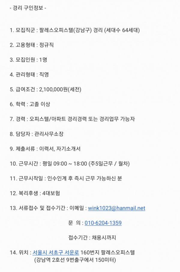 ◇ 모집 : 팔레스오피스텔경리 (세대수 64세대) 강남...